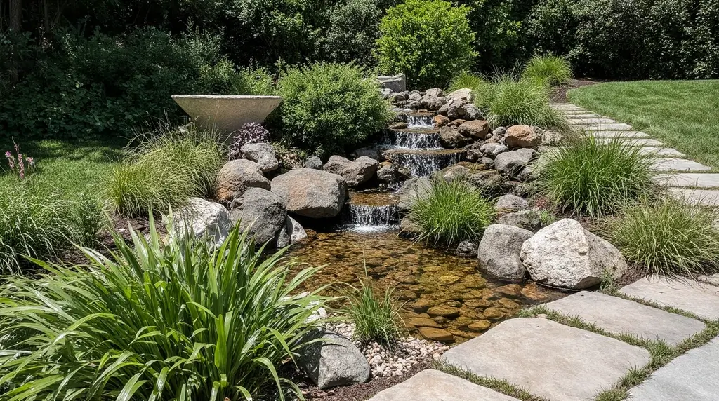 Standalone waterfalls don’t need ponds at all. The water recirculates from a hidden catch basin, and you get all the visual drama with minimal space requirements.